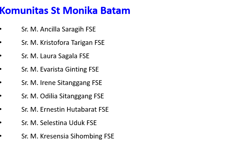 Komunitas St Monika Komunitas / By admin / 27/03/2020 Karya dan Pelayanan RS St Elisabeth Batam Pastoral Terlibat dalam kegiatan Paroki Komunitas St Monika Batam Motto: ”Ketika Aku sakit kamu melawat Aku” (Mat 25:36). Kharisma: Daya kasih Kristus yang menyembuhkan orang-orang yang kecil dan menderita sampai rela wafat di kayu salib